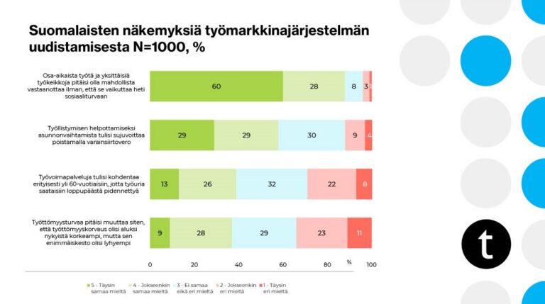 - Kyselyn perusteella näyttää ilmeiseltä, että työnteon kannattavuutta halutaan lisätä ja suomalaiset työmarkkinat koetaan edelleen jähmeiksi. Työttömyys- ja sosiaaliturvaan tulisi tehdä sellaisia muutoksia, että työn vastaanottaminen olisi kaikissa tilanteissa järkevää.