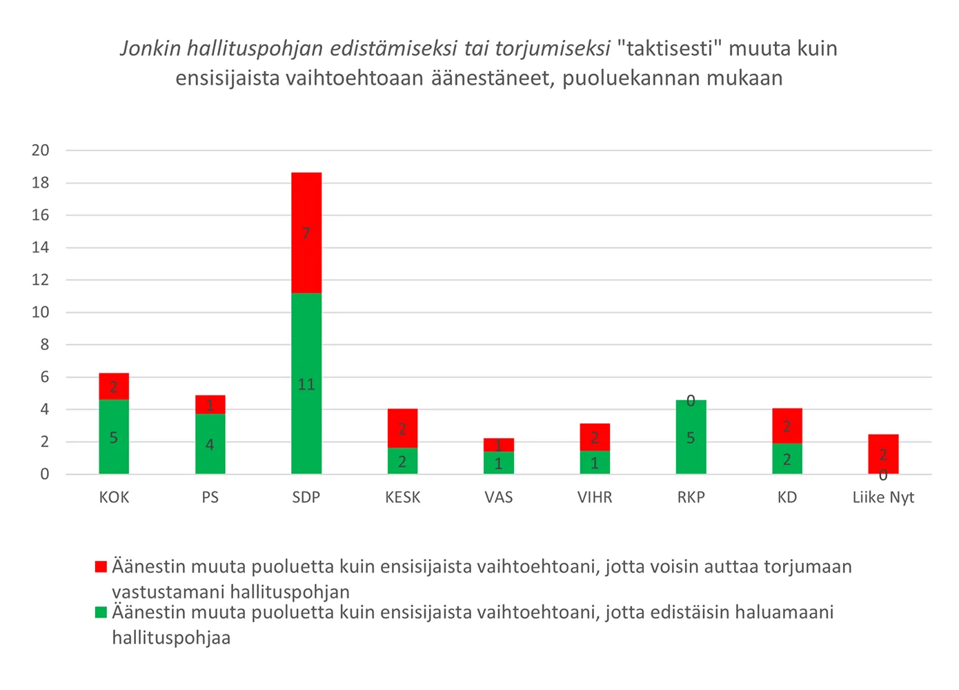 - Perussuomalaisten ja kokoomuksen äänestäjäkunnat (7,3–8,7 % taktikoijia)